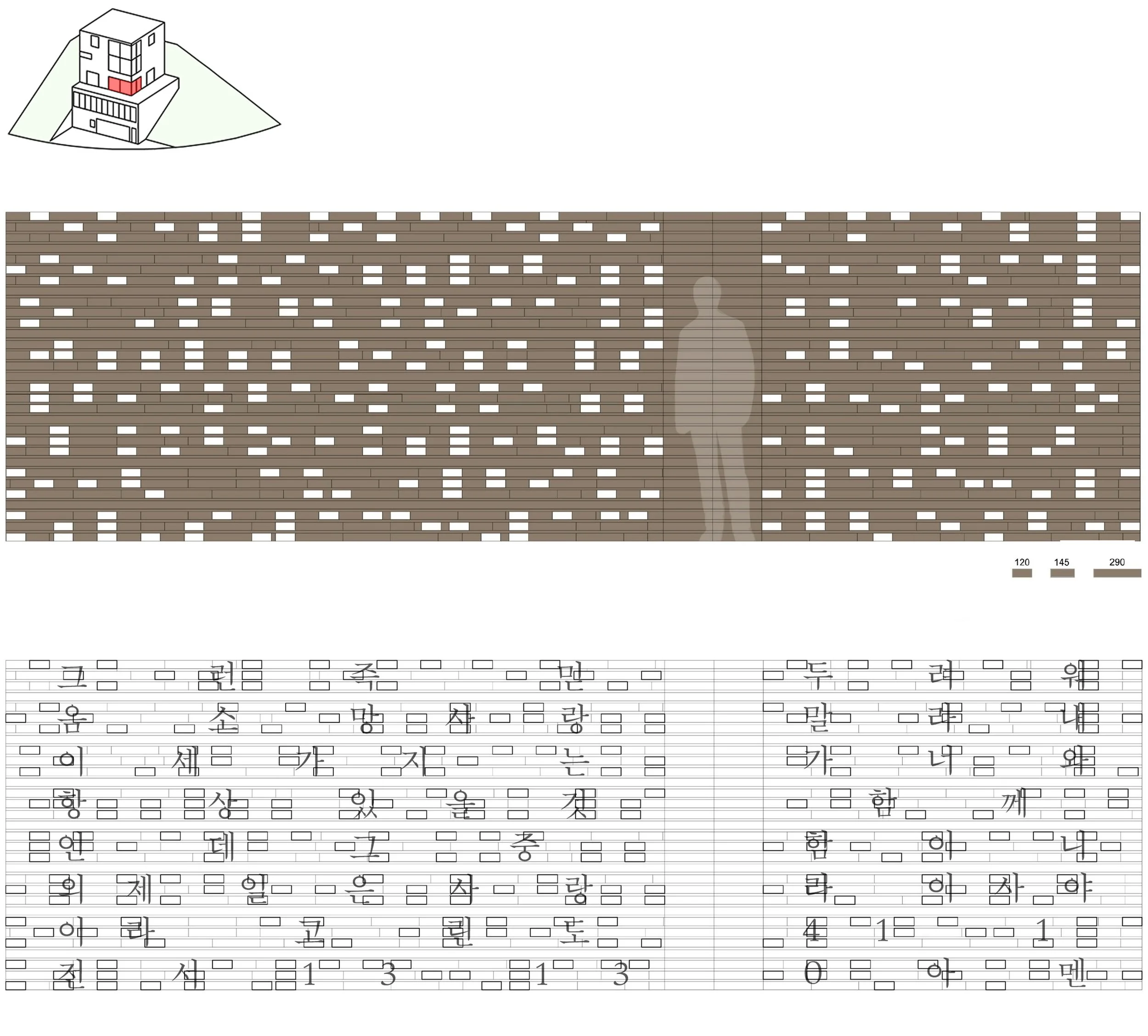 성경 구절 점자 패턴을 적용한 1층 서재 코너벽 벽돌 영롱쌓기 계획 (협업: 김현진) / Brick screen wall plan for the 1F study corner, applying a Braille pattern of a biblical verse (Collaboration: Hyunjin Kim)