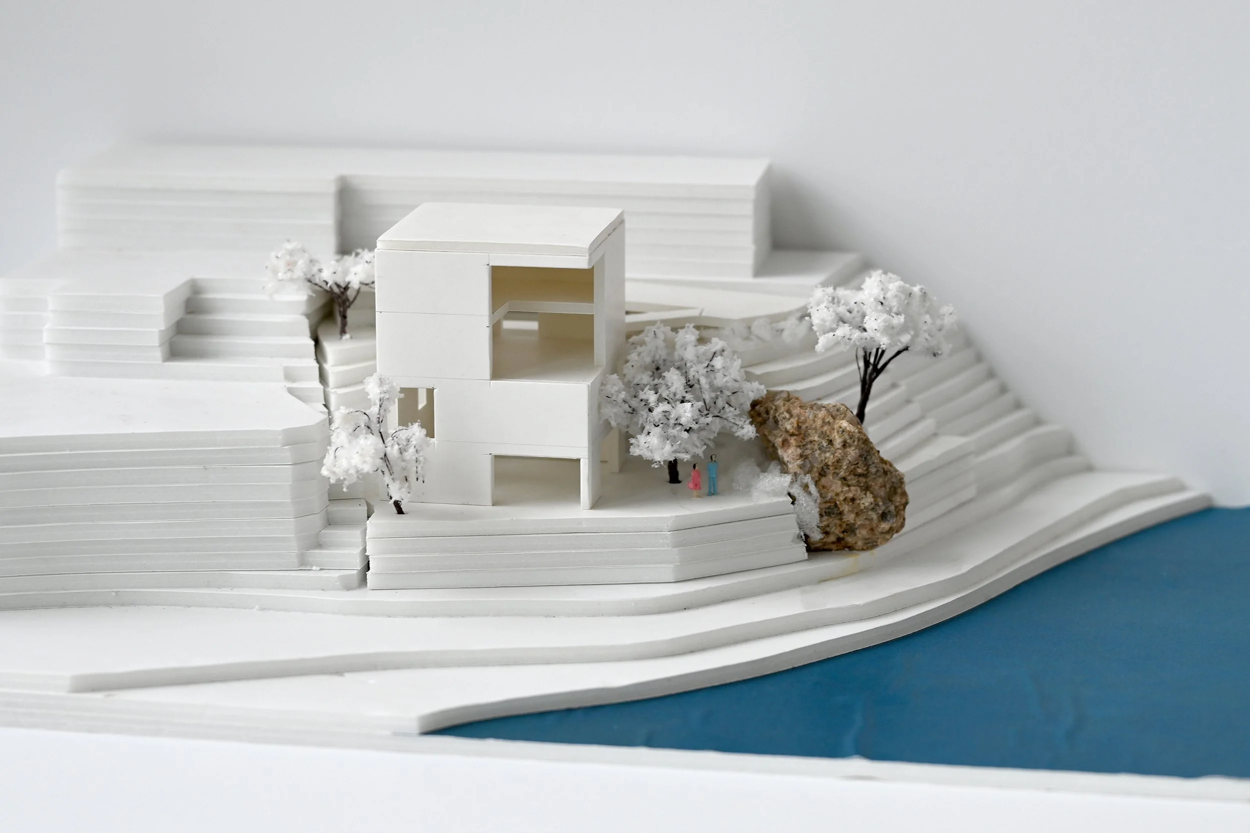 초기 설계 과정에서, 경사지와 여러 기능의 관계를 풀어가는 방안을 모색했다. 우선 경사지를 파내고 건물을 지을 수밖에 없었다. 흙과 퇴적암은 구조적으로 약했다. 주어진 프로그램은 크게 두 종류였다. 하나는 클리닉 혹은 갤러리로 쓰일 다목적 공간이고, 다른 하나는 의사 부부가 쉴 수 있는 사적 라운지였다. 두 프로그램은 어느 정도 분리할 필요가 있었다. 다양한 매스와 공간 구성 스터디를 진행했다. 최종으로 도출한 안은 하부(B2 레벨) 강변 오솔길에서 다목적 공간으로, 상부(2F 레벨) 주택가 도로에서 사적 라운지로 진입하는 구성이었다. 두 프로그램을 수직으로 적층한 것이다. 하나의 단단한 암석과 같은 건축을 디자인 개념으로 삼았다.