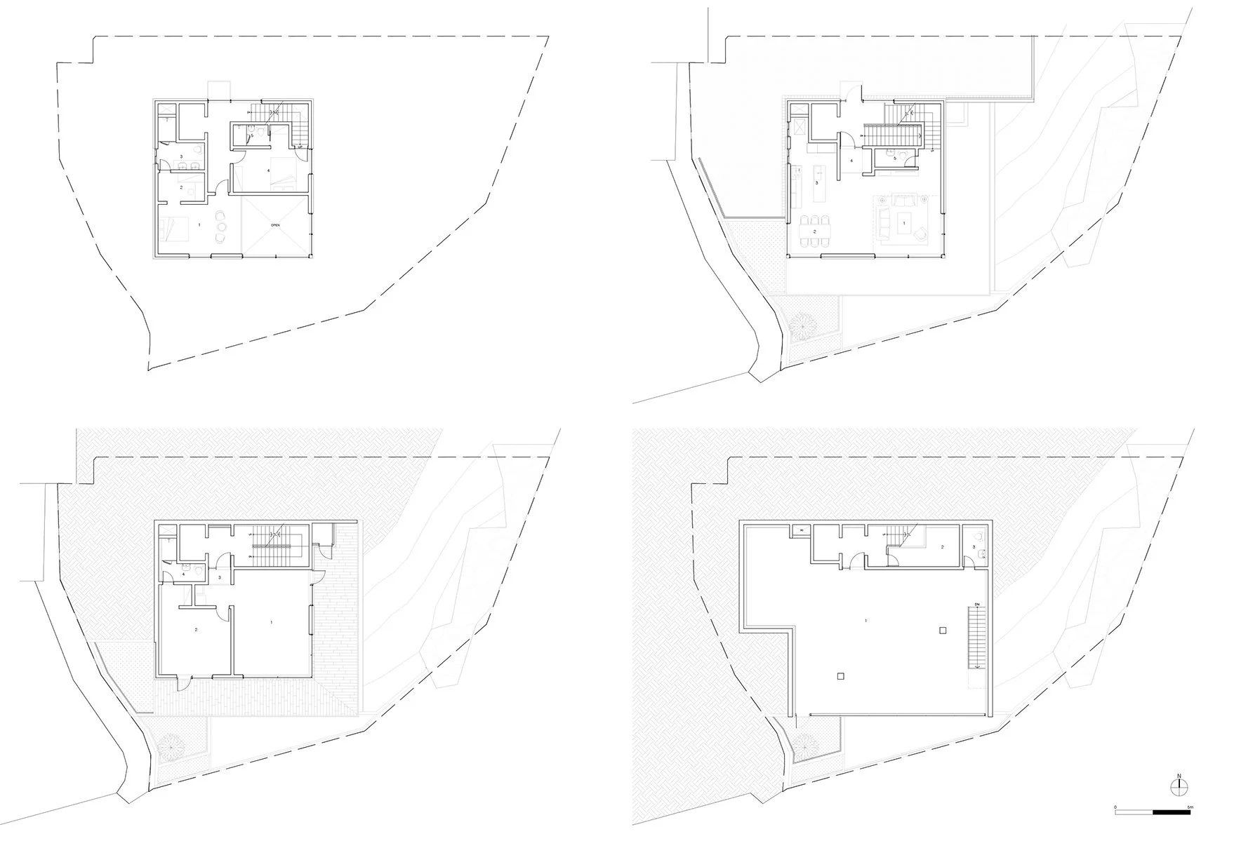 In the early design process, Various ways to make the relationship between the slope and various functions were explored. First, there was no choice but to dig up the slope and build a building. The soil and sedimentary rock were structurally weak. There were two major programs given. One was a multipurpose space that could be used as a clinic or library/study, and the other was a private lounge where the client doctor couple could rest. The two programs needed to be separated to some extent. Different mass and space composition studies were conducted. The final plan was to enter the multipurpose space from the riverside path on the lower B2 level and the private lounge from the residential road on the upper 2F level. The two programs were stacked vertically. The design concept was to create an architecture that resembles a solid rock.