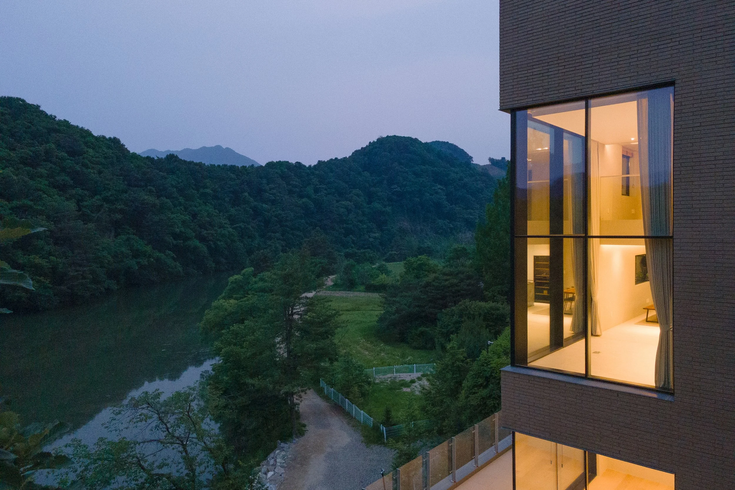 각 층의 내부 기능을 외부 풍경과 연계하는 일은 중요했다. 실마다 고유한 풍경과 감각이 담기도록 계획했다. 지하1층 다목적 공간에서는 강을 따라 수평 파노라마가, 2층 메인 라운지에서는 강에서 하늘로 올라가는 수직 풍경이, 3층 휴식 공간에서는 라운지 상부를 관통하여 동쪽의 일출이, 다이닝에서는 서쪽의 일몰이 보이도록 했다. 밖에서는 단일 건물이지만, 안에서는 서로 다른 삶과 풍경의 이야기가 펼쳐진다. 건물 전체 외부 마감에는 국내산 황토색 벽돌을 사용했다. 대지의 흙 색상과 비슷한 것을 골랐다. 경사지를 파낸 만큼 새로운 땅이 우뚝 선 느낌으로 보이기 원했다. 1층 서재 외벽에는 원래 벽돌 영롱쌓기를 제안했는데, 전면유리창으로 변경되었다. 계획한 영롱쌓기의 빛구멍 패턴은 건축주 부부가 고른 성경 구절을 점자로 만든 것이었다. 이것이 실현되지 못한 점은 아쉬움으로 남는다.