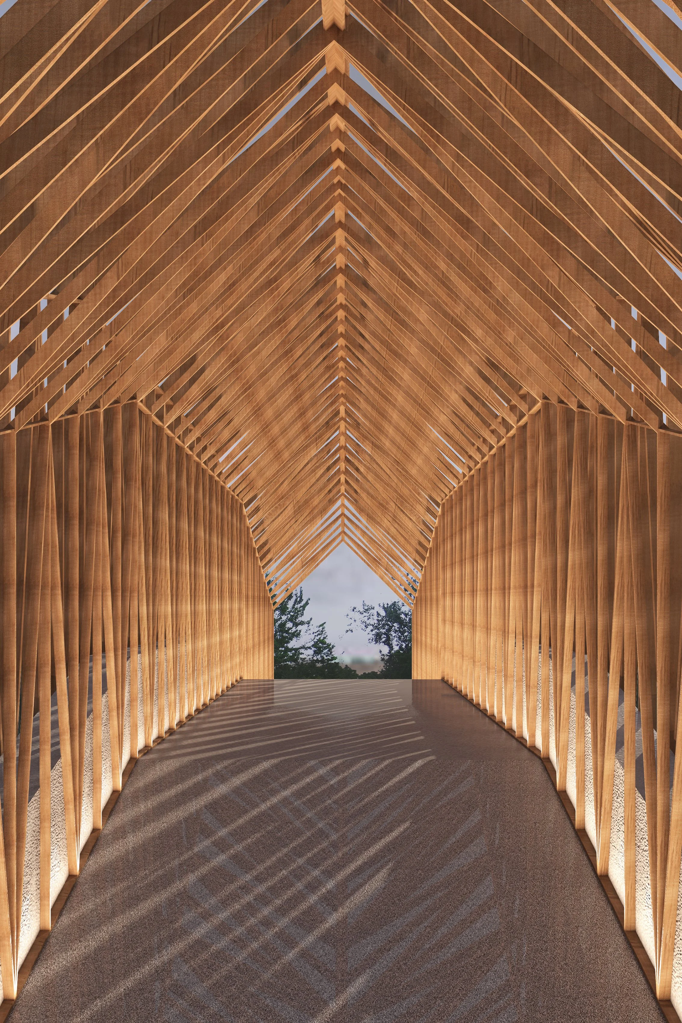 It is a bridge project planned in Maiim Vision Village located in Yeoju. There is an existing concrete bridge over the national railway, but it does not match the overall atmosphere of the elegant village. Focusing on the light effects of sunrise and sunset reflected in the forest around the site, a bridge of light made of a double-layered wooden structure was proposed. The inside and outside of the bridge changes in various ways depending on the sunlight and nighttime lighting, and it becomes small landmark offering the pleasure of taking a walk on nature.