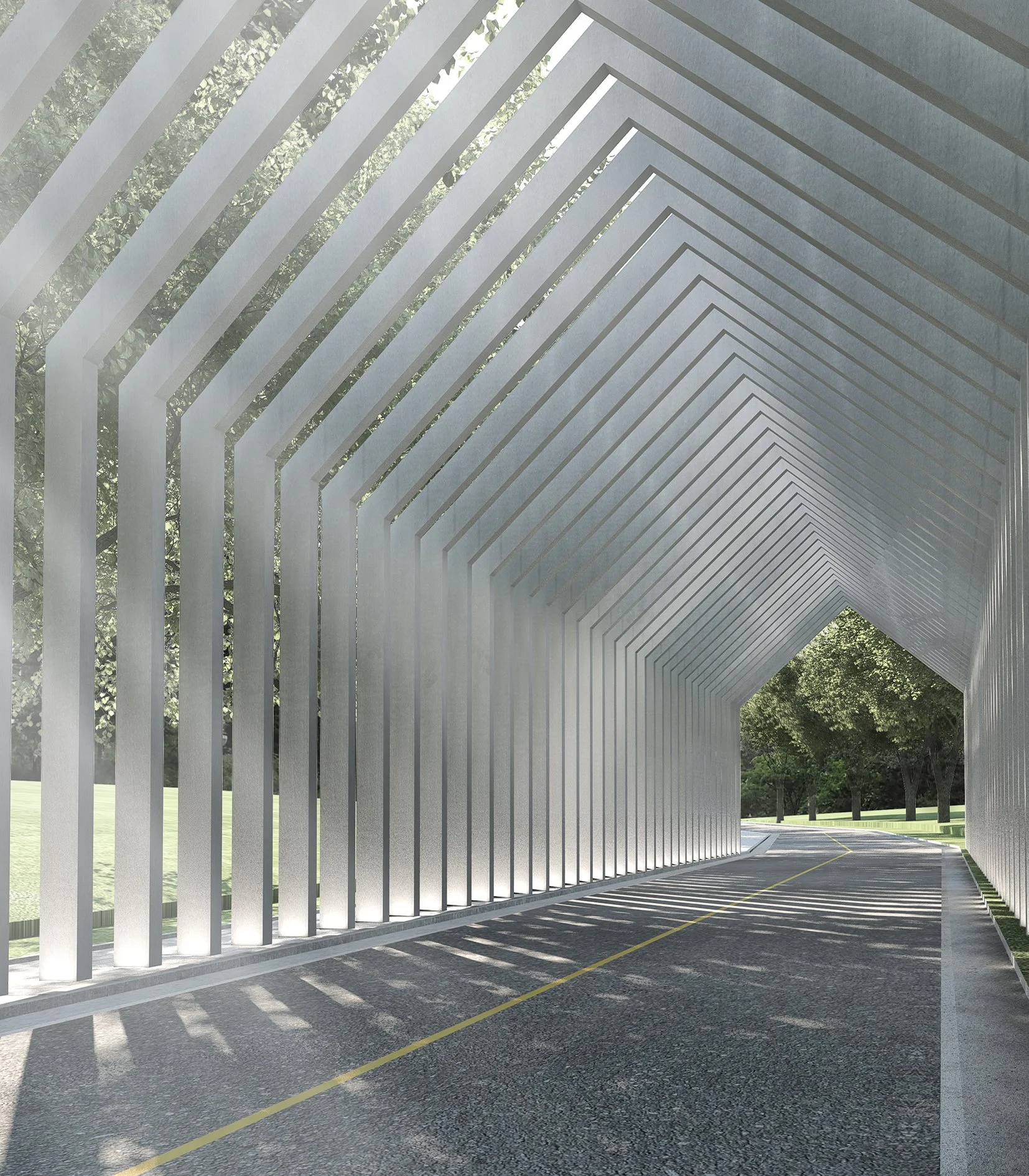 This is a project that designed the entrance space for Sian Family Memorial Park. It is composed of a cuboid-shaped sign tower and a triangular roof-shaped passageway. The height of the sign tower made of stone was considered so that it could be recognized from the two-way road approaching the memorial park. The stone wall that gently curves along the entrance road gives a sense of direction and immersion. The triangular roof-shaped passage that follows is made by repeating 42 steel structures. The interior space, which gives a perspective effect, strongly conveys the feeling of heading somewhere to those entering the memorial space. The passage space where light and shadow permeate symbolizes the eternal house in which we all return.