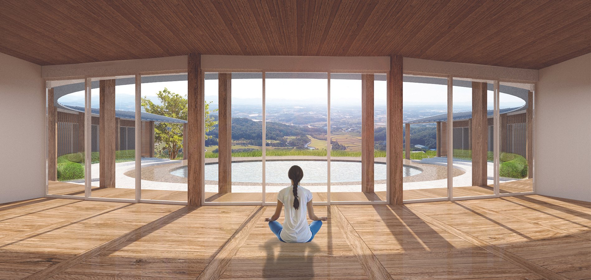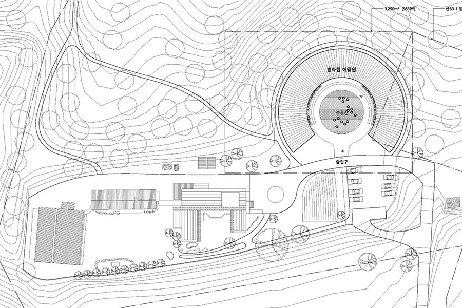 Haetalwon is a temple stay building planned in Beophwarim located in Eumseong-gun, Chungcheongbuk-do. Beophwarim is a temple and Buddhist practice community founded by Venerable Deokhyeon, a disciple of Venerable Beopjeong. Beophwarim’s activities are conducted centering on meditation, the core of Zen Buddhism. There is an empty site surrounded by large oak trees in Beophwarim land, the shape of the site is already circular. Based on the site condition, a circular horizontal structure with a central courtyard was proposed. The circular space symbolizes the fundamental spirit of Mahayana Buddhism beyond topography and place. Looking down from the site located on the hillside, the fields of Eumseong-gun are unfolded in a panoramic view toward the south, which is directly connected to the internal and external experiences of the proposed architectural space. When people participating in Temple Stay program in their own rooms, they can see the scenery of the surrounding mountains and oak trees. In the courtyard, a water space with lotus flowers was provided, and a circular passage for walking meditation.